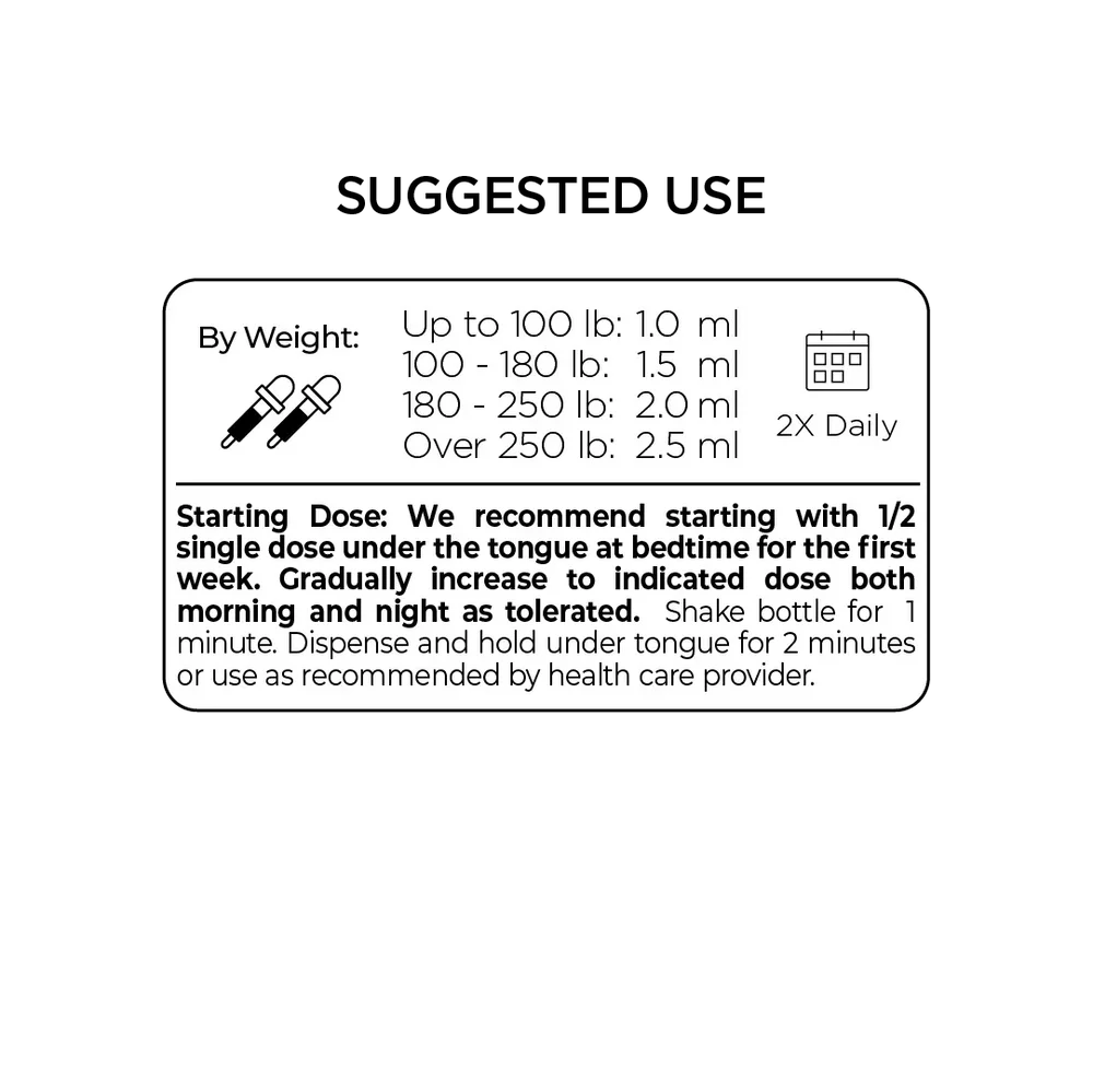 Starting Dose: We recommend starting with 1/2 single dose under the tongue at bedtime for the first week. Gradually increase to the indicated dose both morning and night as tolerated. Shake bottle for 1 minute. Dispense and hold under the tongue for 2 minutes, or use as recommended by your healthcare provider.